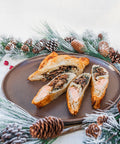 Petit Koulibiac de saumon confectionné à base de saumon d'Atlantique du Nouveau-Brunswick, de risotto aux fromages, d'épinards et d'une duxelle de champignons, le tout couronné d'un œuf en haut et enveloppé dans une pâte feuilletée croustillante. Ce produit fait maison est idéal pour un brunch copieux ou en tant qu'entrée.